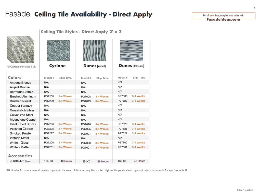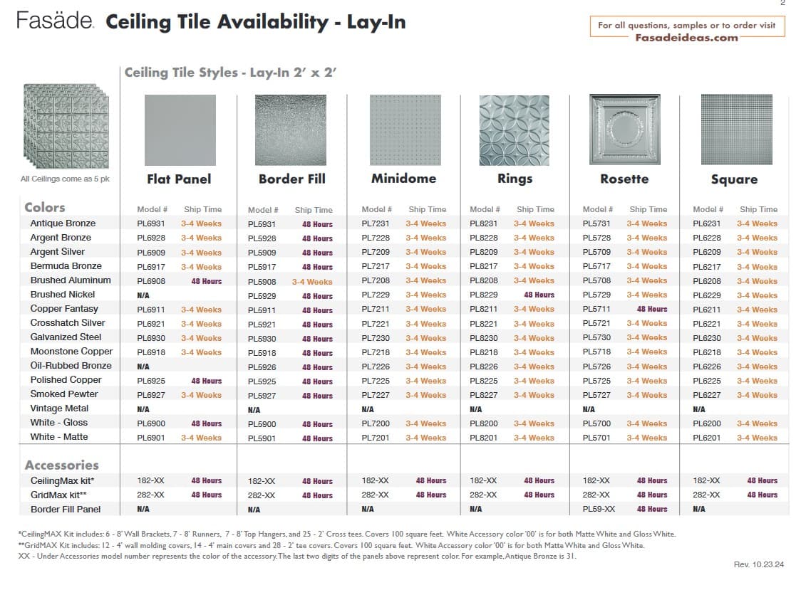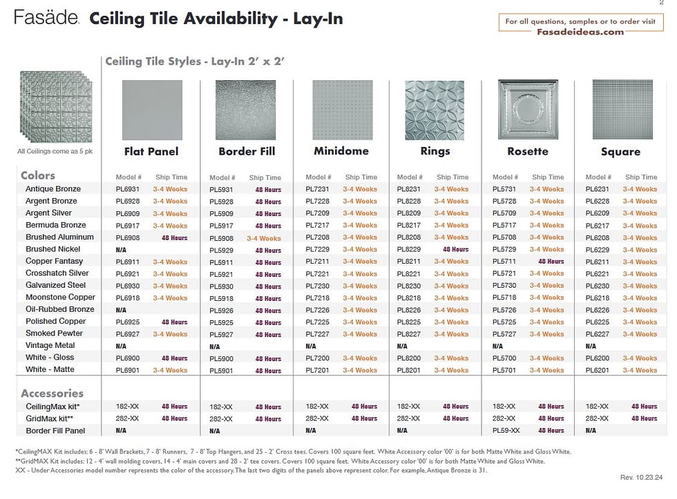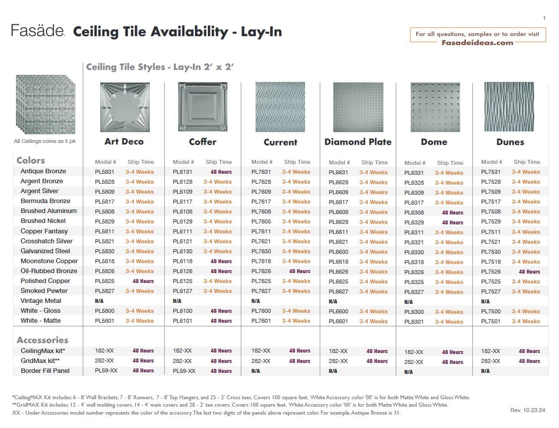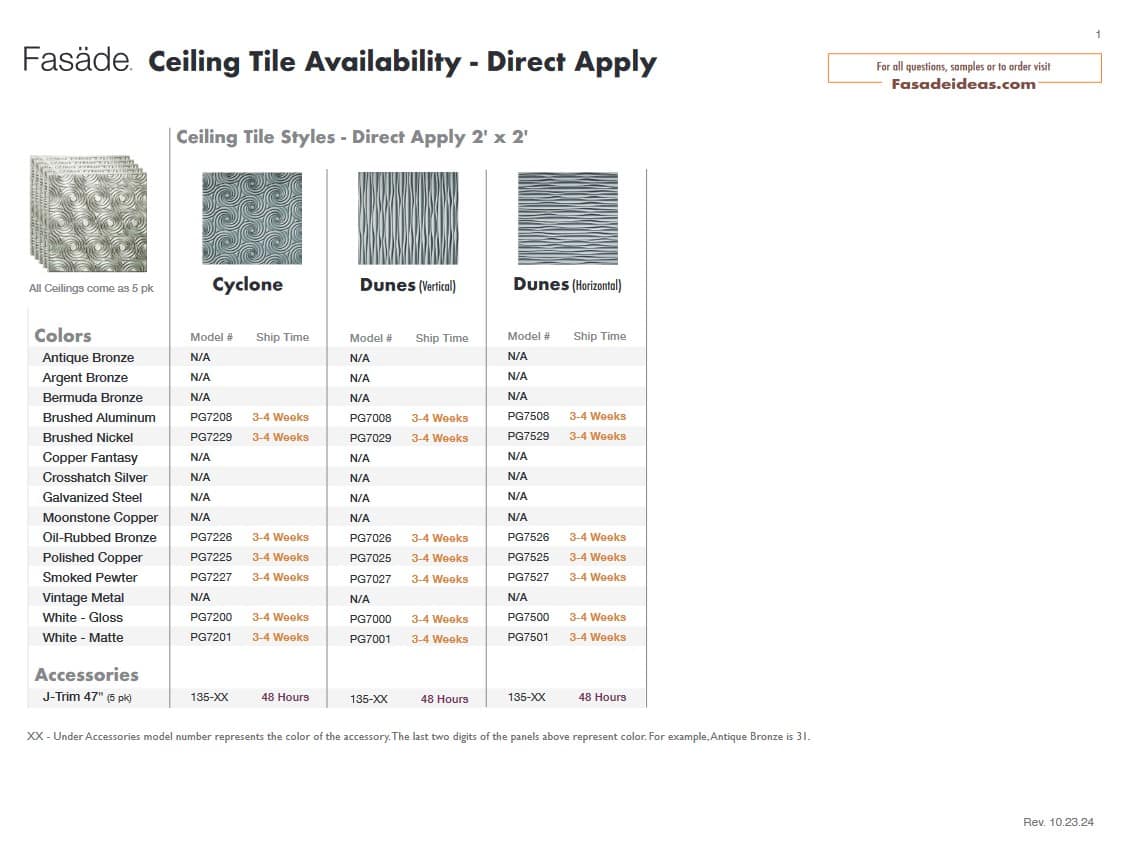 Ceiling Product Availability Direct Apply (Glue Up) Ceiling Lead Times Direct Apply Ceiling Availability PDF Lay-In (Suspended) Ceiling Lead Times Lay-In Ceiling Availability PDF
