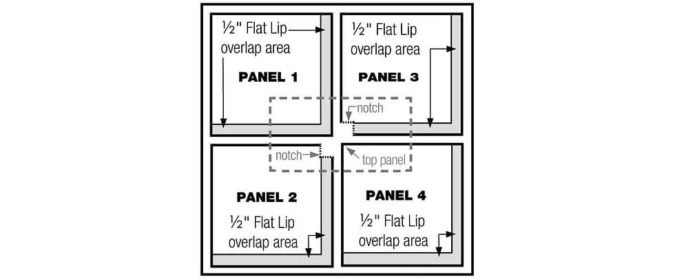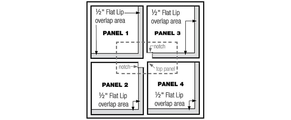 - Understand the overlap feature. Prior to installation, it is important to understand the overlap feature of each panel. Each panel has two 1/2″ flat lips for overlapping. Arrange all panels this way so additional panels can be added to the top or right side of any panel.
