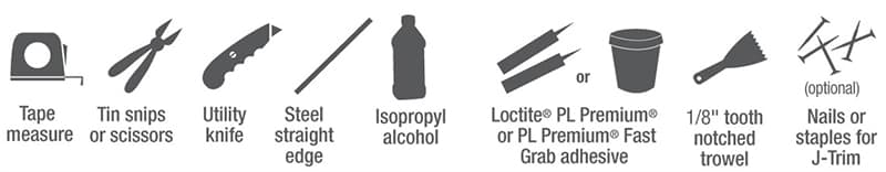 If Edge J-trims were purchased for finishing off your ceiling edges, you can attach the trim to the ceiling panels or to the ceiling along the perimeter, before installing the ceiling panels. If applying the trim to perimeter of ceiling first, the trim can be bonded to the ceiling using Loctite PL Premium® adhesive by applying a 1/8″ bead to the back of the trim and pressing firmly on to the ceiling. Nails or staples can be used to tack trim in place until adhesive is cured.