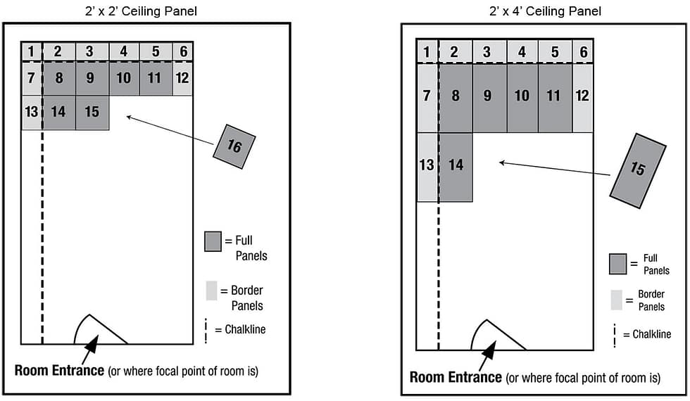 - Determine the room layout. Map your ceiling on graph paper before beginning installation. Locate and draw any light fixtures, heating vents, intersecting hallways, closets and doorways. Occasionally these features can influence starting points, tile placement and finished ceiling design.To ensure professional looking results, the room layout should be balanced with panels centered in the room and equal size border panels used on opposite sides of the room. To find out what size to cut the border panels in one direction, see the formula below. Then repeat formula for other direction.
